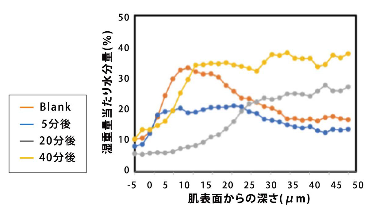 RO水を塗布した肌では、塗布5分後に水分量が増加し、20分後、40分後 に低下し、Blankの状態に戻る傾向が見られました。